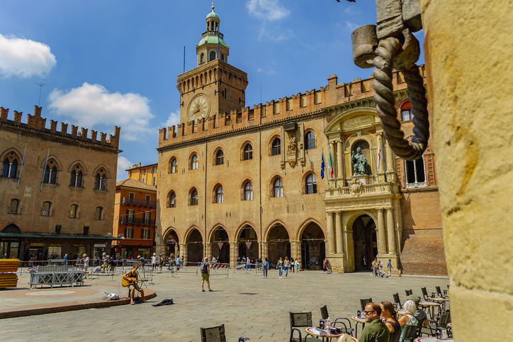 Sulla piazza si affacciano edifici importanti come il Palazzo del Podestà e la Basilica di San Petronio, la cui facciata è un magnifico contrasto di chiari e scuri che diventano ancora più suggestivi al tramonto.