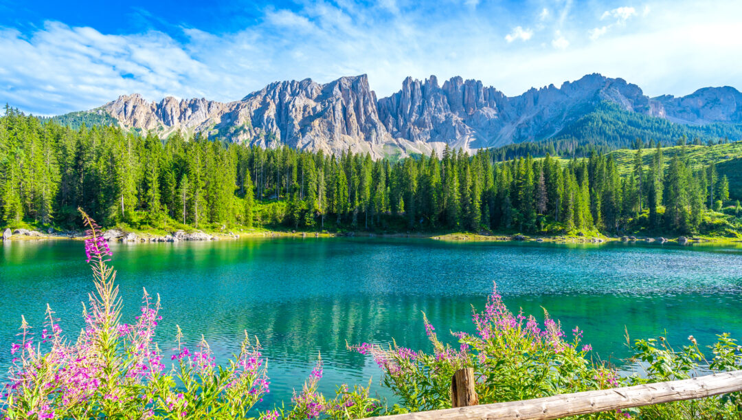 Il lago di Carezza è uno specchio d’acqua incantevole circondato da una fitta foresta di abeti e dominato dalla cima frastagliata del Latemar.