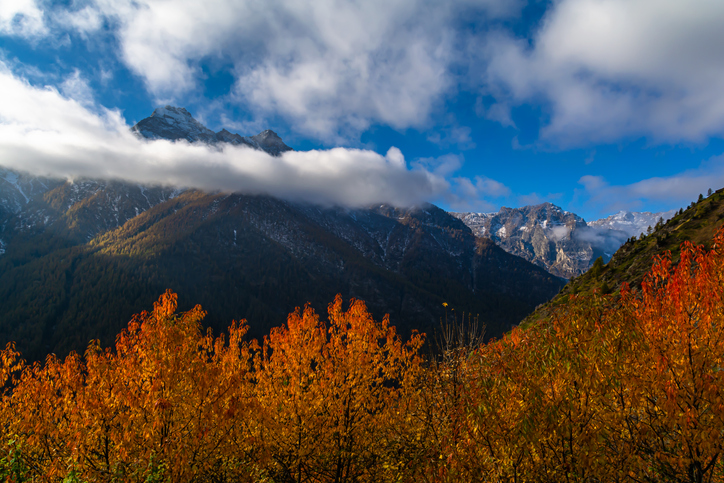 Quando l’autunno avanza e le prime nevicate imbiancano le creste, il contrasto tra il giallo dei boschi e il bianco delle cime rende il paesaggio estremamente suggestivo e visivamente potente.