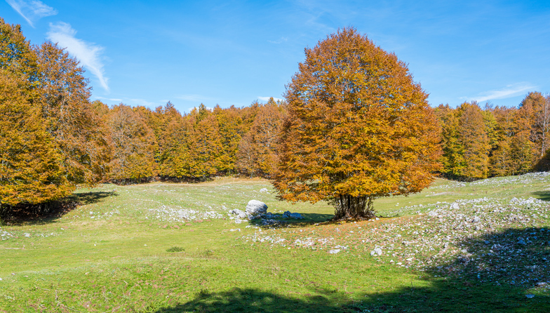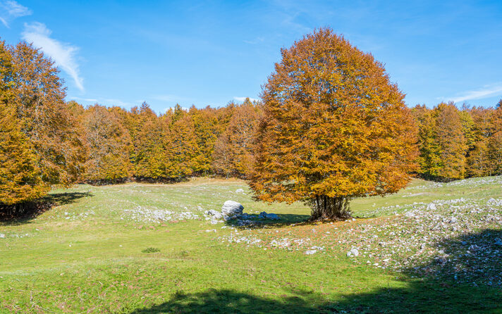 I Monti Simbruini, con le loro estese faggete e pianori carsici, diventano un luogo magico per il foliage d’autunno nel Lazio, a pochi chilometri da Roma.