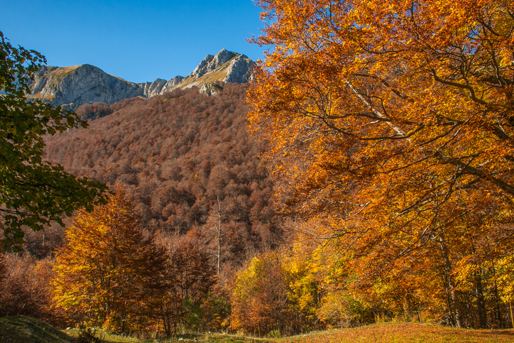In autunno i boschi di faggio, acero e carpino si tingono di arancione, rosso e giallo, creando un tappeto di foglie sotto i sentieri.