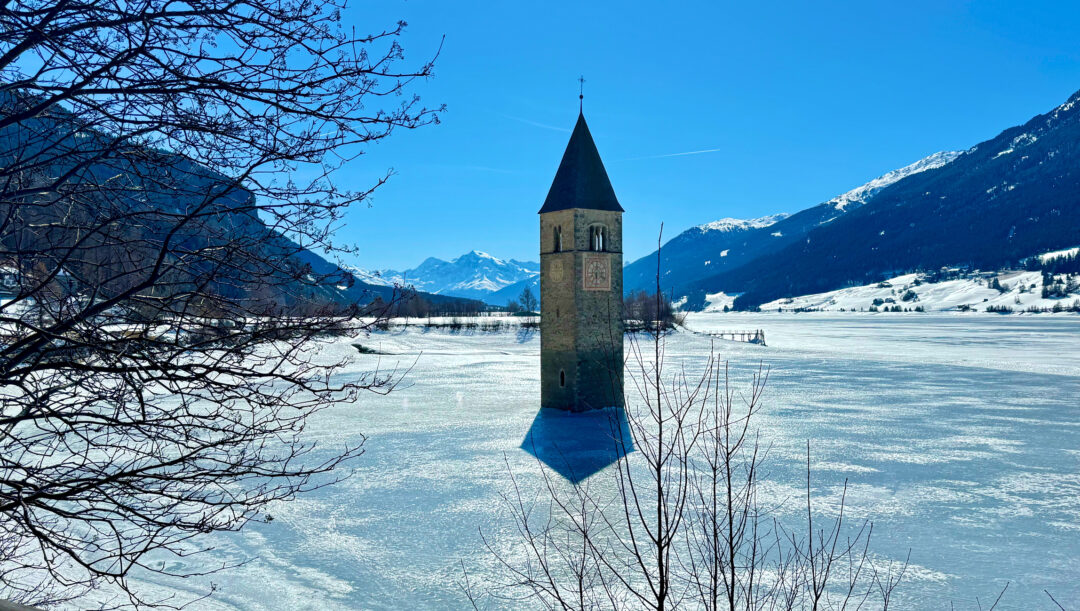 Il Lago di Resia si trova in Val Venosta, nell’estremo nord-ovest dell’Alto Adige, ed è il bacino artificiale più grande della regione.