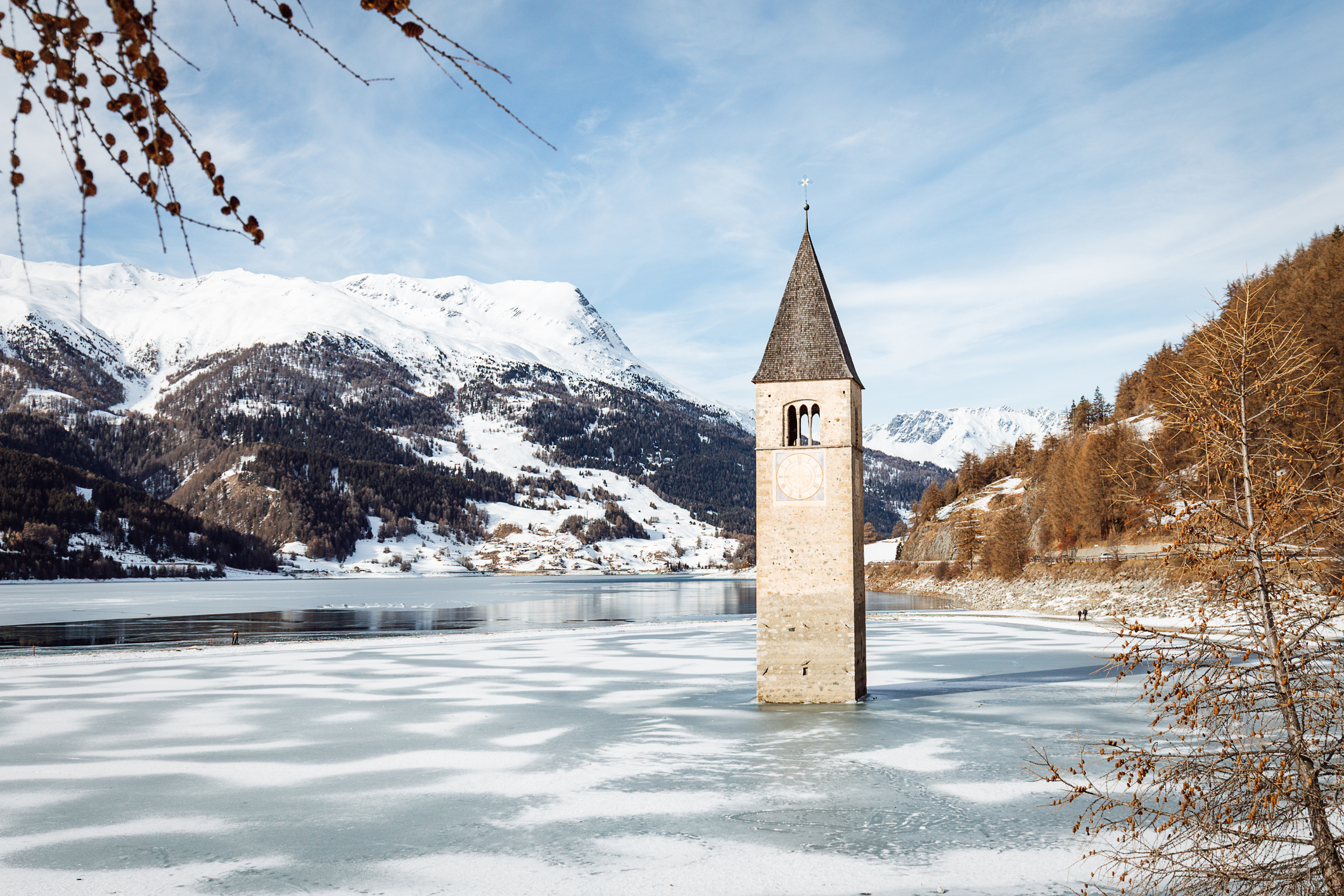 La sua notorietà è legata al campanile romanico del paese di Curon, che emerge solitario dalle acque ed è diventato uno dei simboli più riconoscibili delle Alpi italiane.
