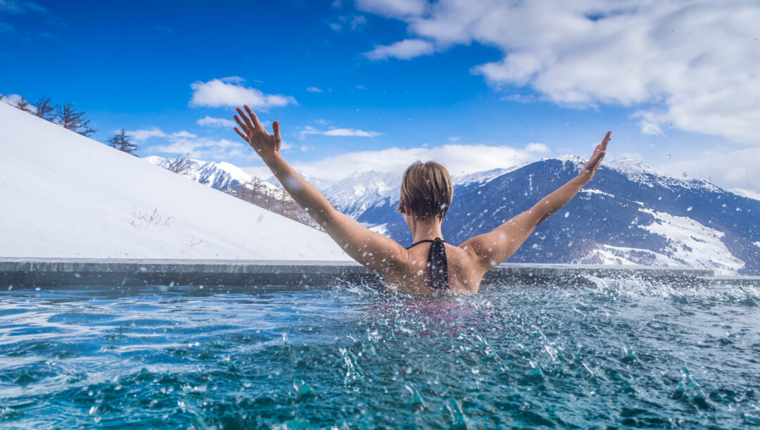 Frau geniesst Bergpanorama im Winter vom Pool aus