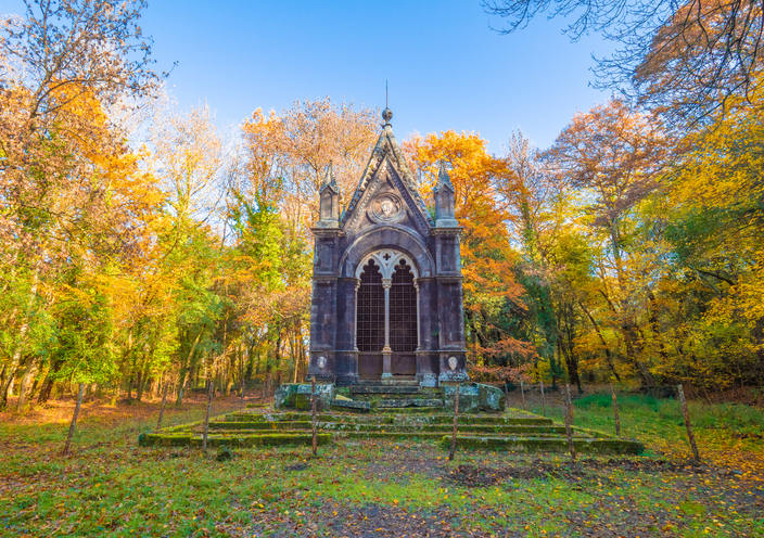 Il marchese non solo creò un dedalo di percorsi nel bosco monumentale, ma anche un piccolo mausoleo in stile neogotico: volle realizzarlo per sé, celato tra le piante di questo luogo incantato.
