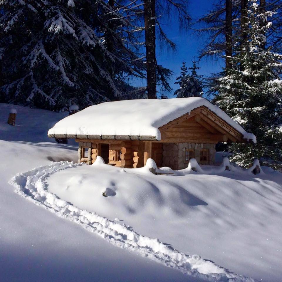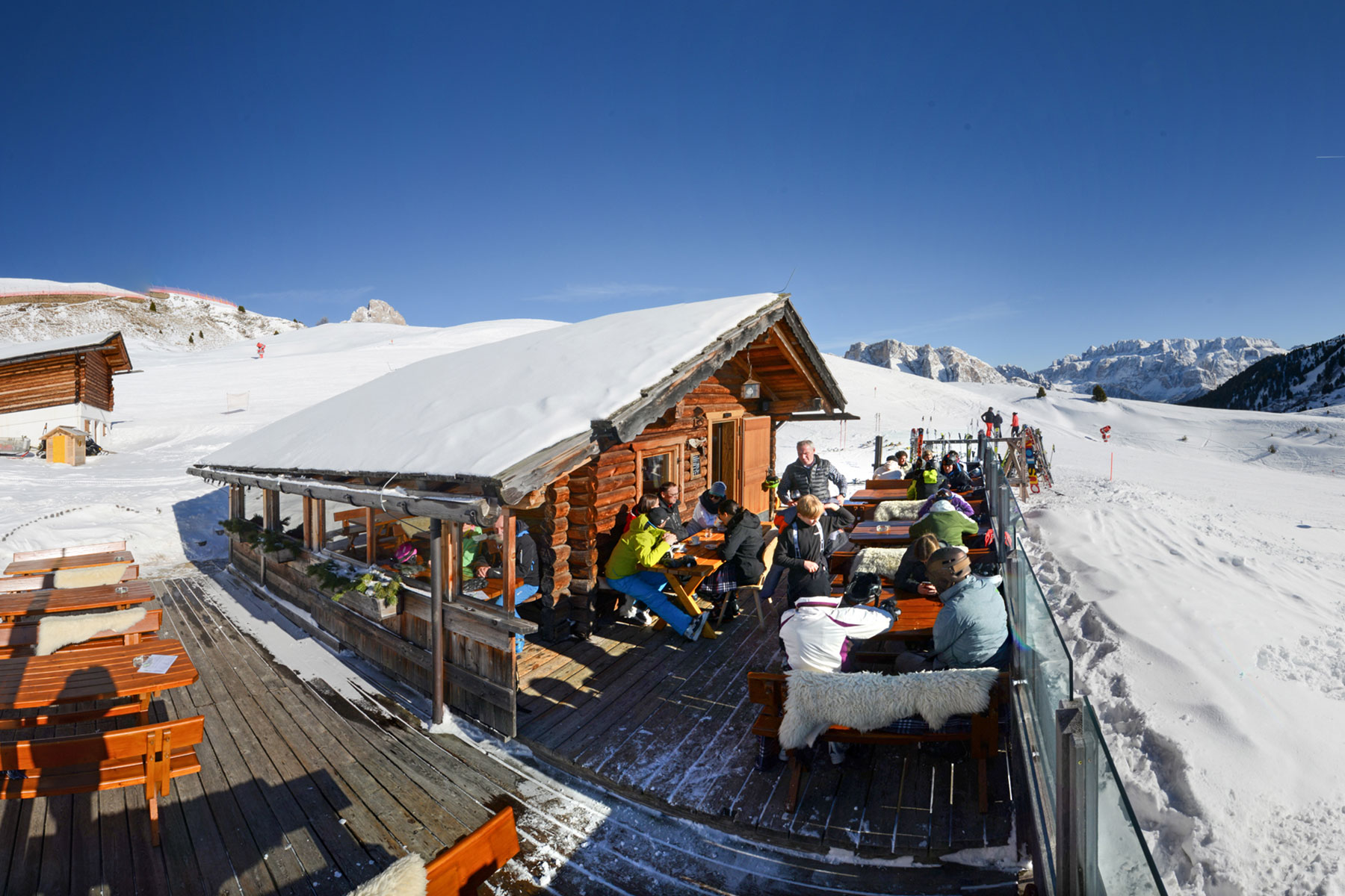 Fatta interamente di tronchi di legno, la Baita Ciampac è raggiungibile a piedi da Selva o con gli sci dal Dantercepies.