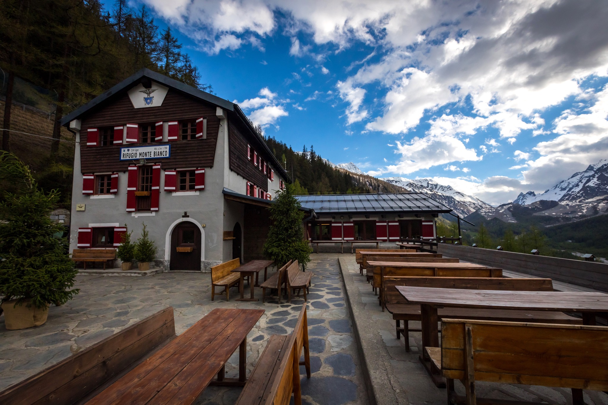 Affacciato sulla Val Veny, a 1.700 metri di quota, il Rifugio Monte Bianco si trova in una delle posizioni più spettacolari dell’intera Valle d’Aosta. Da qui lo sguardo spazia verso le Grandes Jorasses, la Brenva e le immense pareti che caratterizzano il massiccio del Monte Bianco.